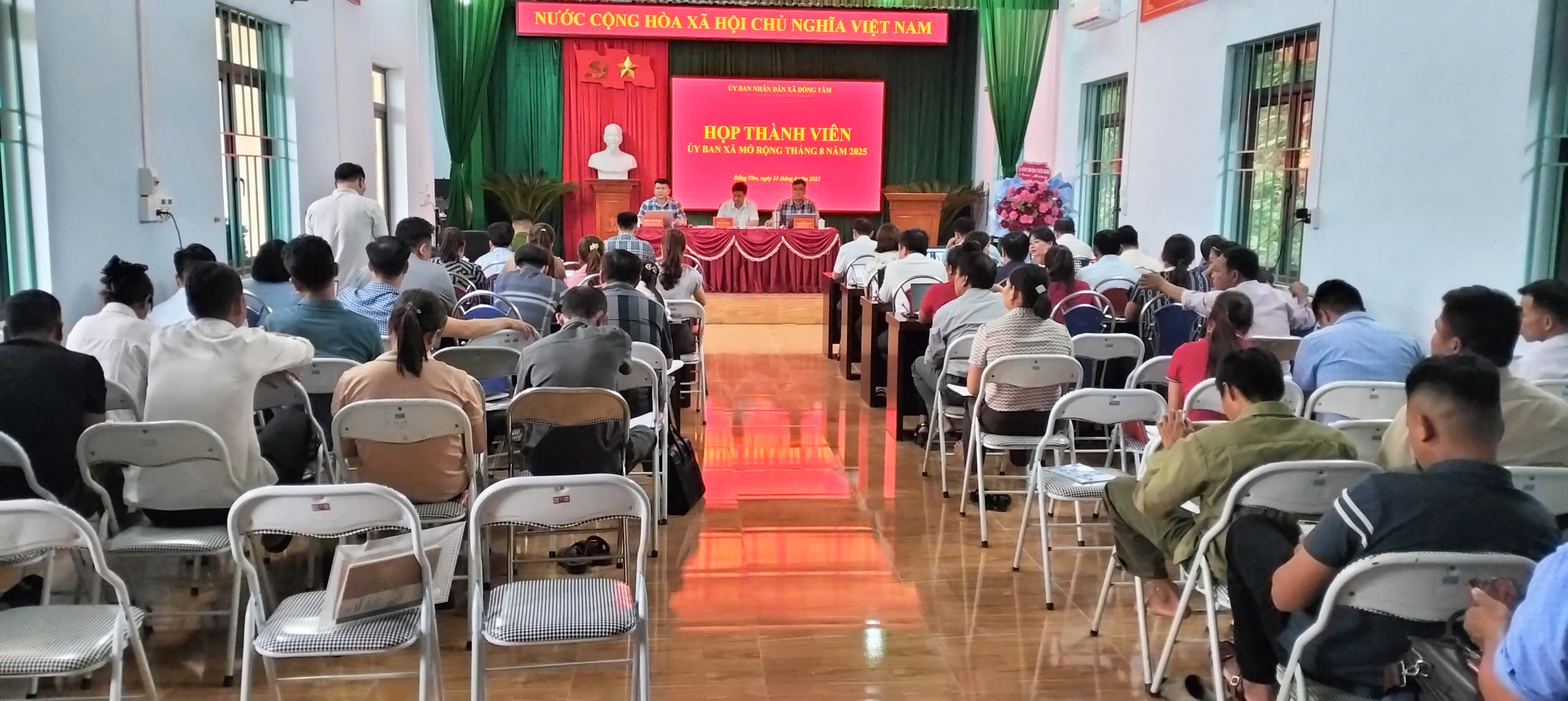 Thực hiện Quyết định số 01/QĐ-UBND, ngày 01/7/2025 Quyết định ban hành Quy chế làm việc của Ủy ban nhân dân xã Đồng Tâm khóa I, nhiệm kỳ 2021-2026 Từ ngày 14 giờ 00 phút, ngày 25/8/2025 Ủy ban nhân dân xã Đồng Tâm đã tổ chức phiên họp Thành viên Ủy ban nhân dân xã mở rộng tháng 8 năm 2025. Chỉ trì phiên họp: Tập thể Lãnh đạo UBND xã nhiệm kỳ 2021-2026. Các đại biểu dự phiên họp: Mời Thường trực HĐND xã; tập thể lãnh đạo, công chức, chuyên viên các phòng chuyên môn, tập thể Ban giám hiệu các trường học trực thuộc UBND xã và Trưởng các thôn trên địa bàn xã Đồng Tâm.